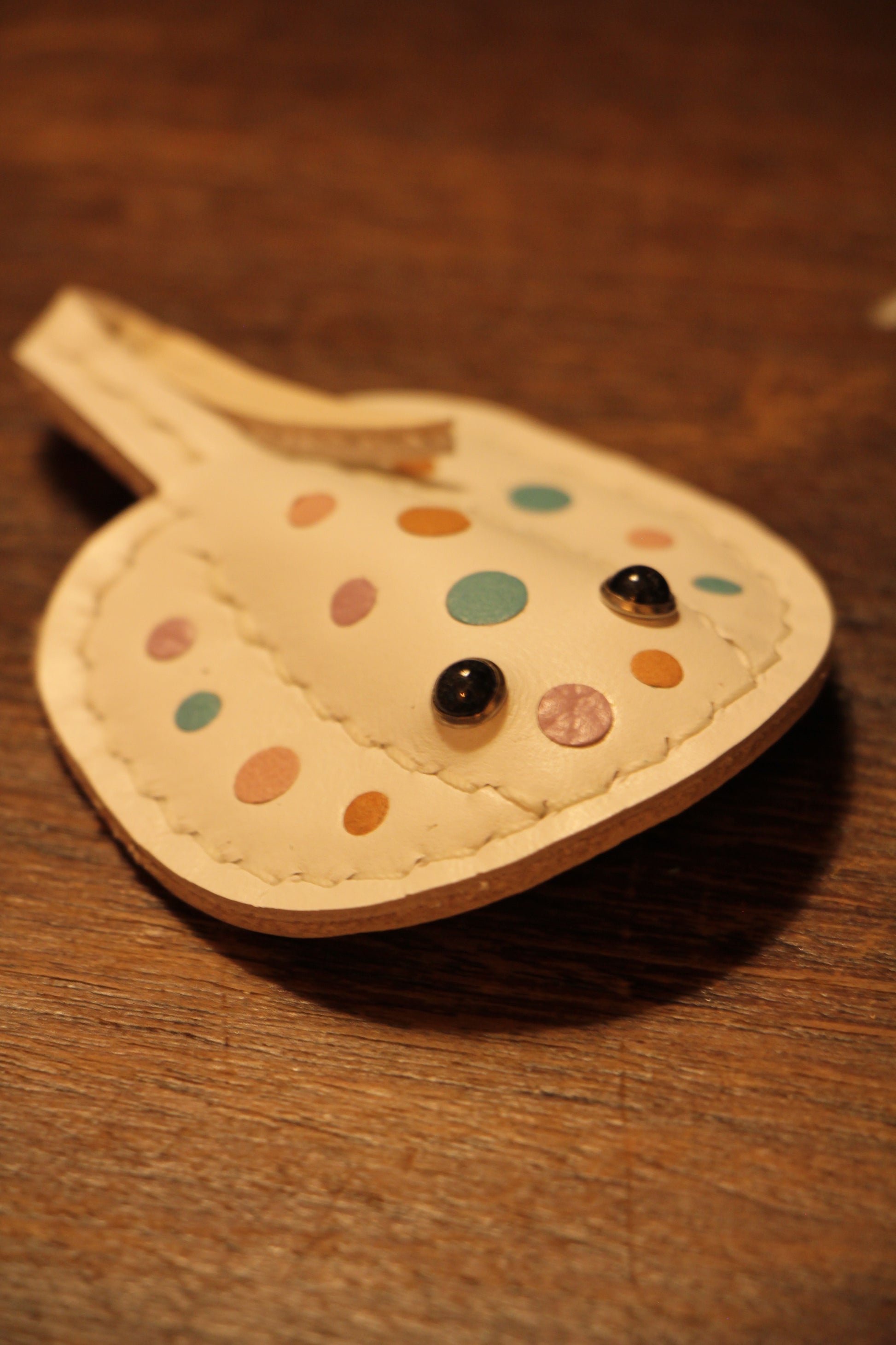 I have a friend who loves guitars and stingrays but constantly loses her keys, especially on frantic Monday mornings. So, I made a leather stingray keychain that holds a guitar pick and has a magnet. Now, this stingray can guard her pick and make sure she always knows where her keys are. Besides a guitar pick, what else do you want to feed this stingray with?